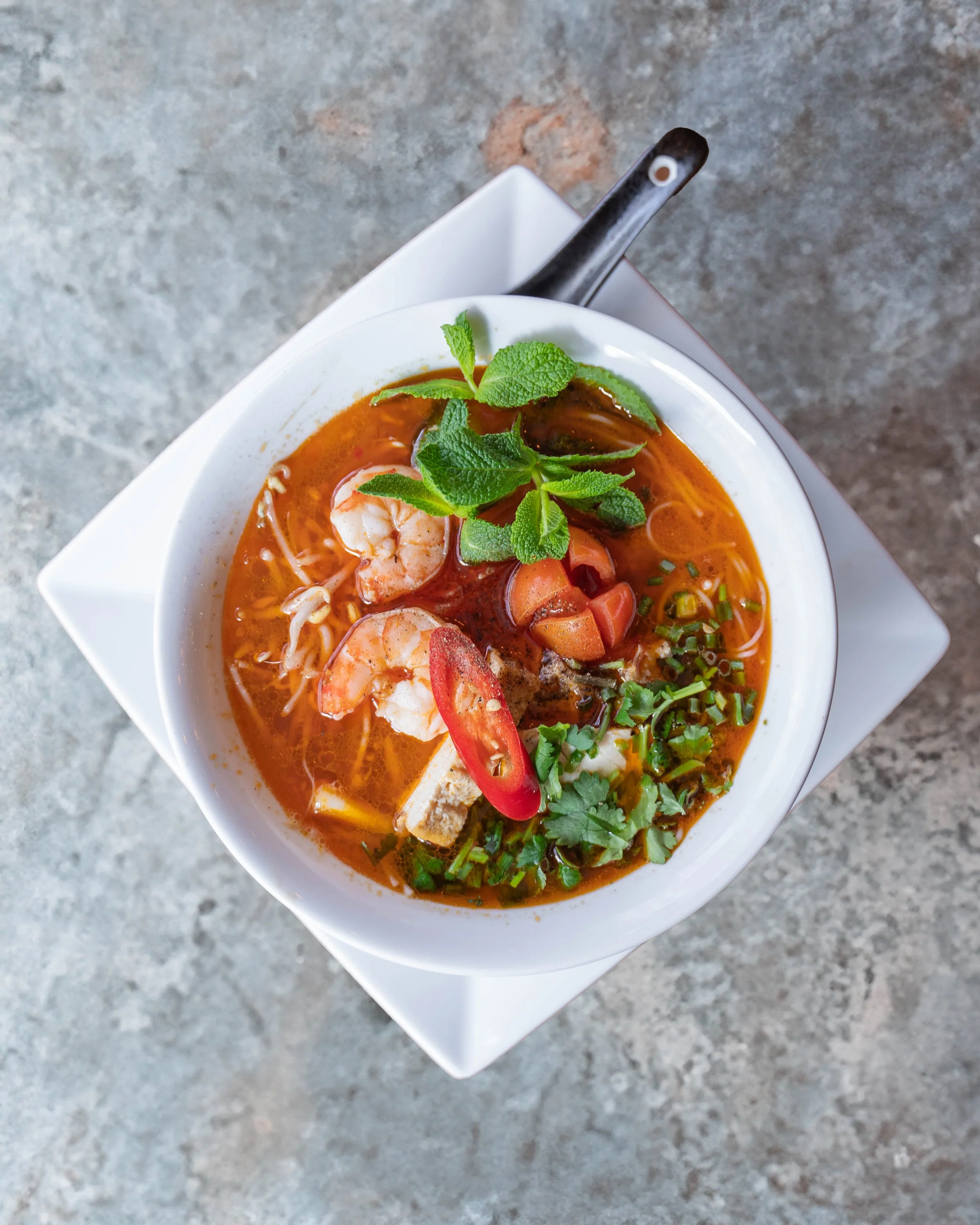 RISNUDELSOPPA (Vietnamesisk krabbsoppa), tofu, kycklingfärs, räkor, krabbkött, fermenterad räkpasta, tomat, kycklingbuljong, böngroddar, örter.